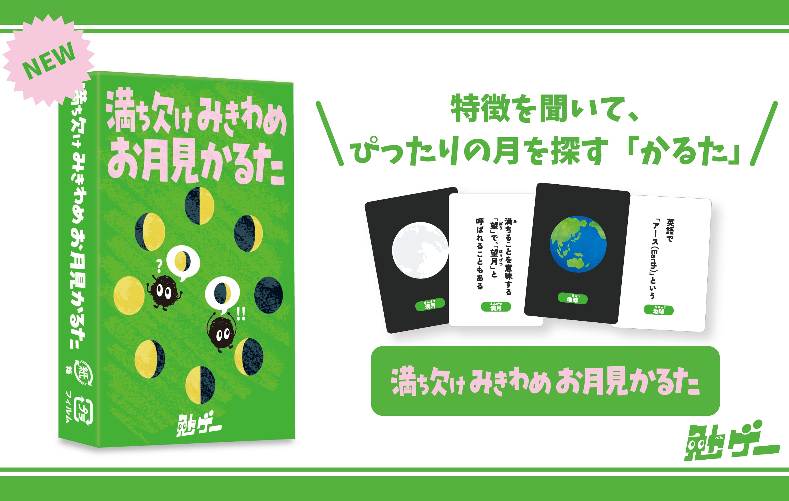 「新月」「三日月」「上弦の月」「満月」—地球や太陽との位置関係から、月の満ち欠けをみきわめよう。月の形や名前をすばやく言えるようになり夜空を見上げるのが楽しみになるお月見カードゲーム。